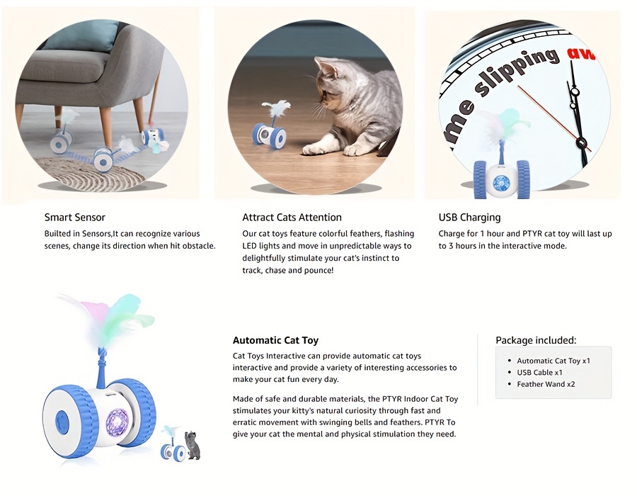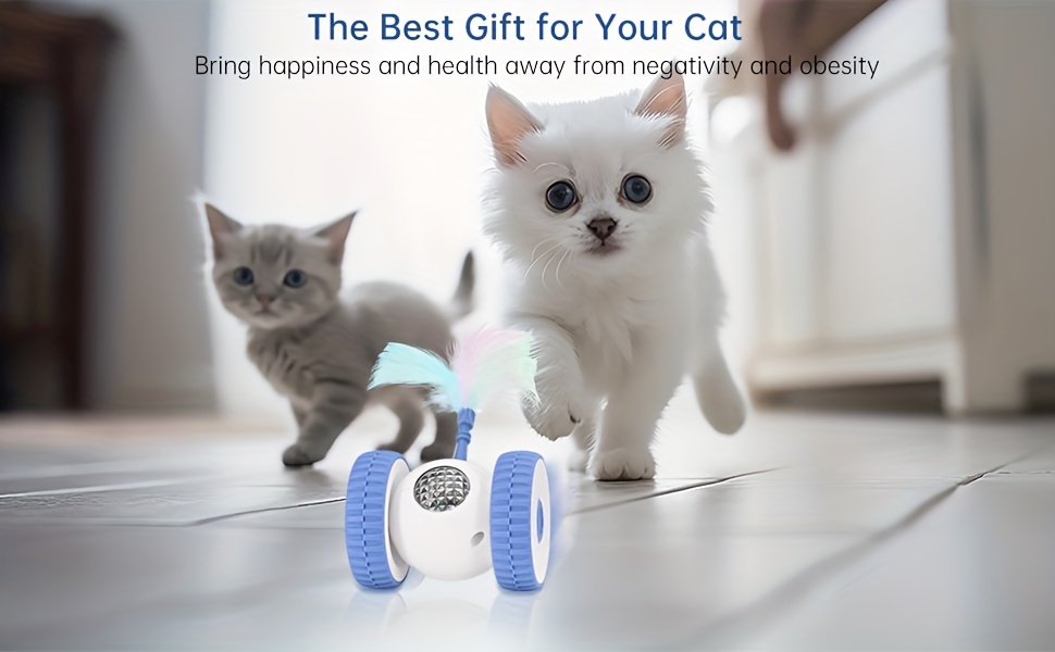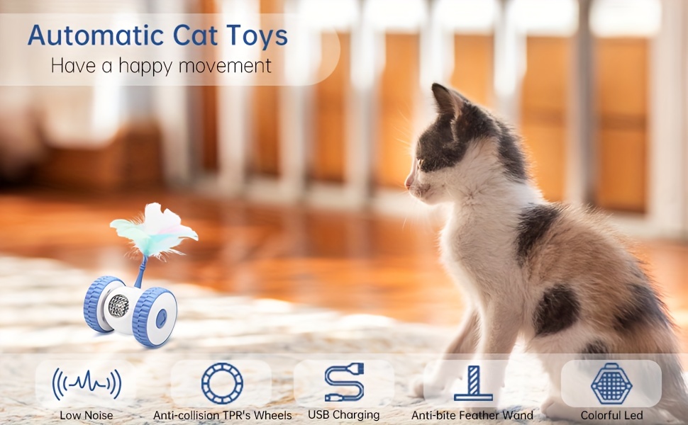 Automatic Cat Toys, Interactive Cat Toys For Indoor Cats With LED Lights And 2 Feathers, USB Rechargeable Moving Kitten Toys, Electric Cat Toys With Durable Wheels, Auto On/Off