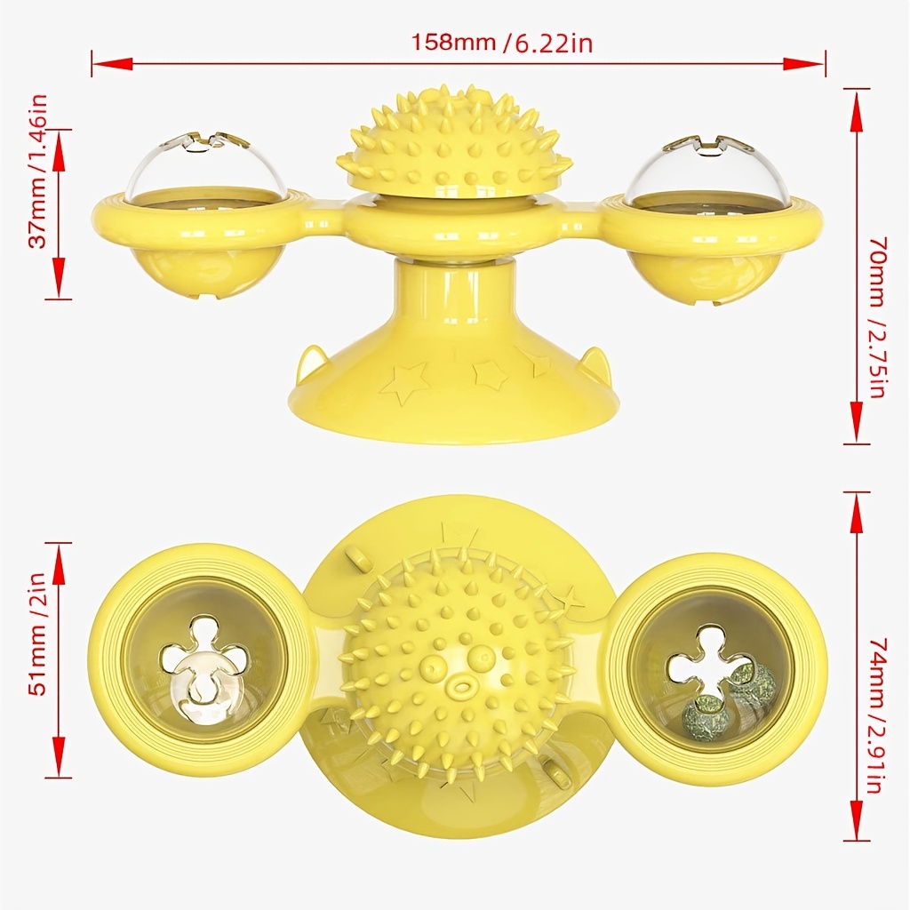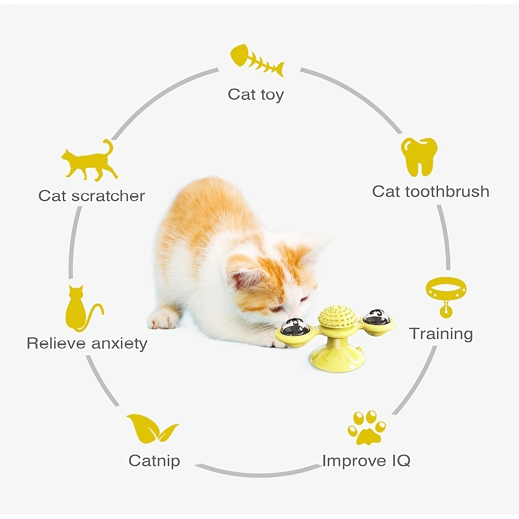 Feature: 1.Funny Cat Boring Toys. From Now On, Your Cat Will Enjoy Being Fed. 2.Updated Materials - Health, Anti Bite And Anti Fall, Make Your Cat Lively And Cheerful, Happy To Play, Healthy Growth. 3.Cat Turns Windmill Is Easy To Attach To Any Surface With Adhesive.And It Is Rotatable For Your Cat To Play With It, Have Fun And Be Healthy. 4.When The Windmill Is Gently Moved, It Will Rotate, Making The Cats Love Not Releasing Their Claws, And There Is A Hair And Face Rubbing Device In The Middle